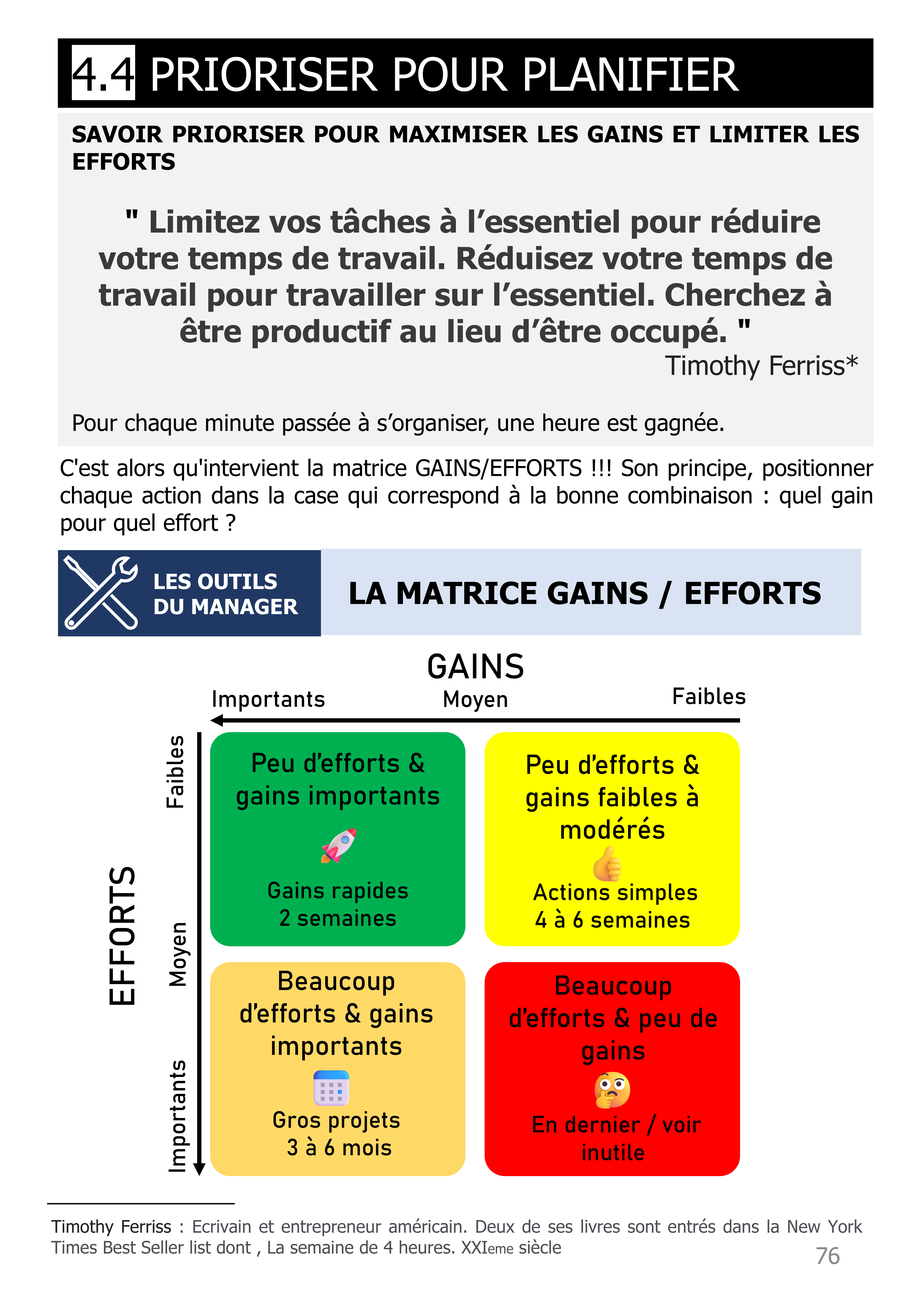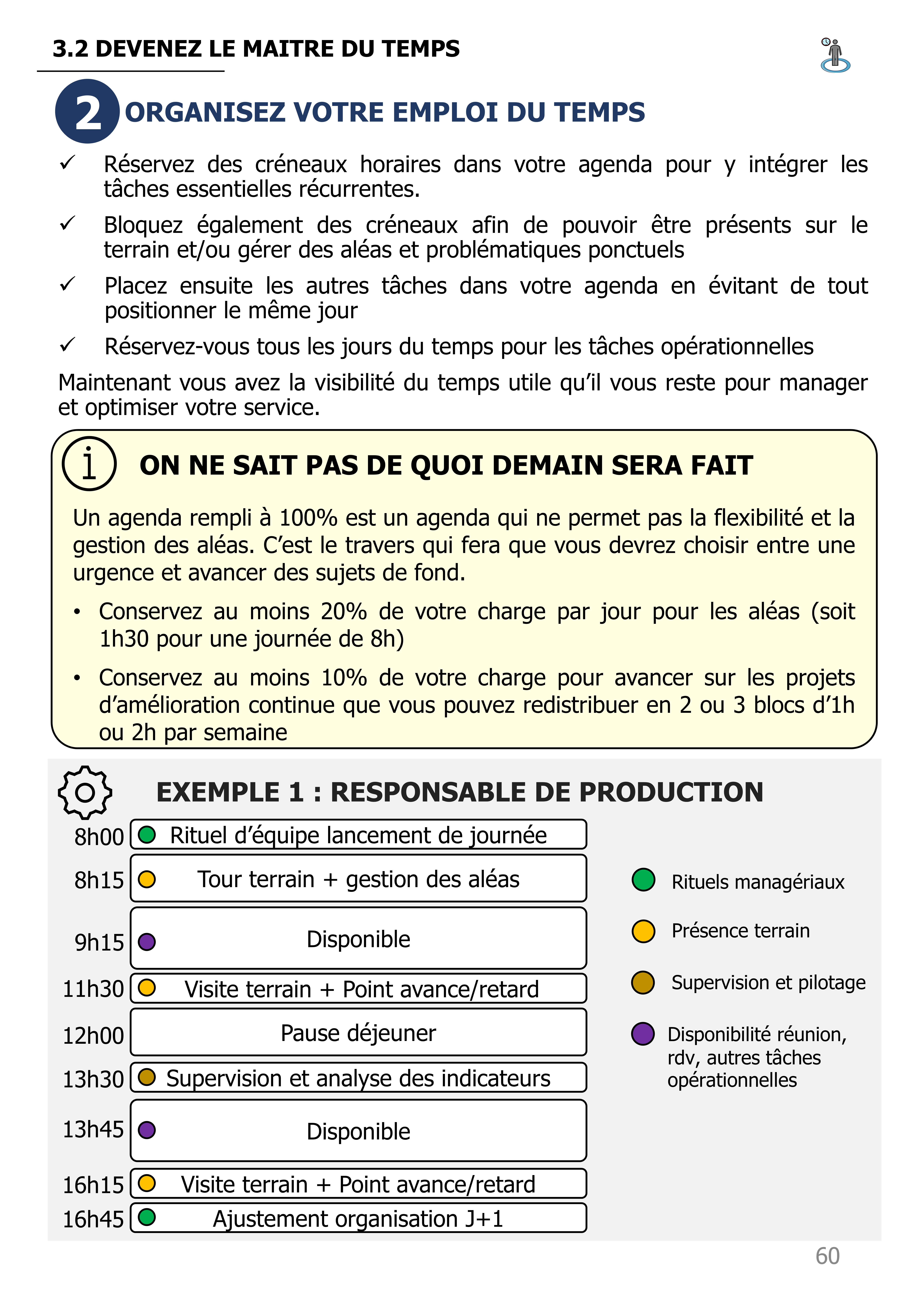 - Optimiser votre temps : Construisez un agenda standard pour optimiser votre emploi du temps, permettant de consacrer plus de périodes à l'amélioration continue.
